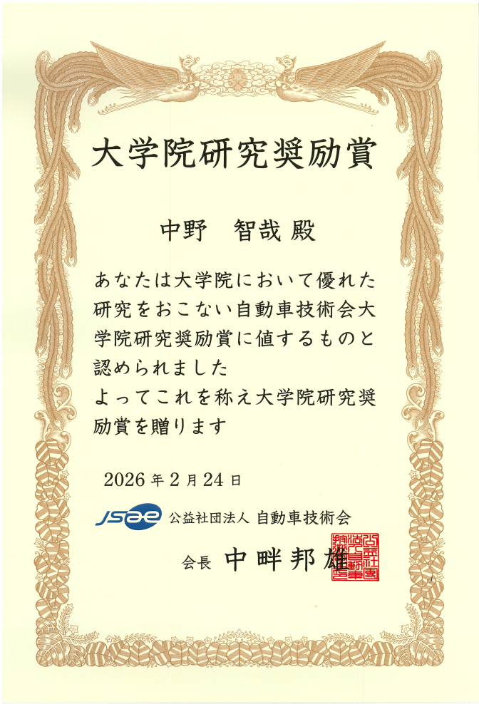 自動車技術会大学院研究奨励賞を受賞しました(M2:中野)